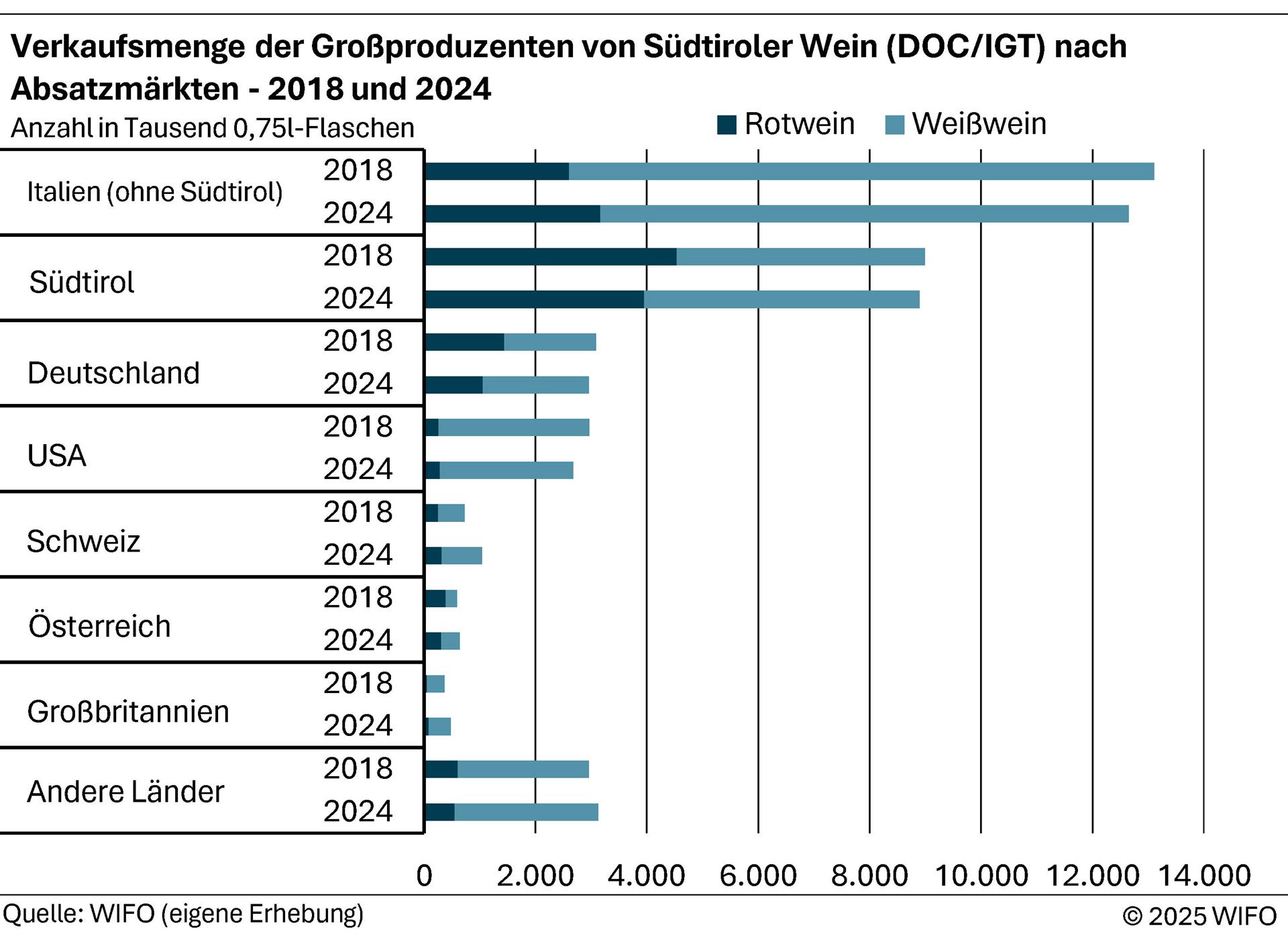 Die 19 größten Produzenten - darunter Genossenschaften und private Betriebe - verkauften im Jahr 2024 rund 33 Millionen 0,75-Liter-Weinflaschen, davon 70 Prozent Weißweine. Insgesamt ist die Verkaufsmenge seit 2018 leicht rückläufig.