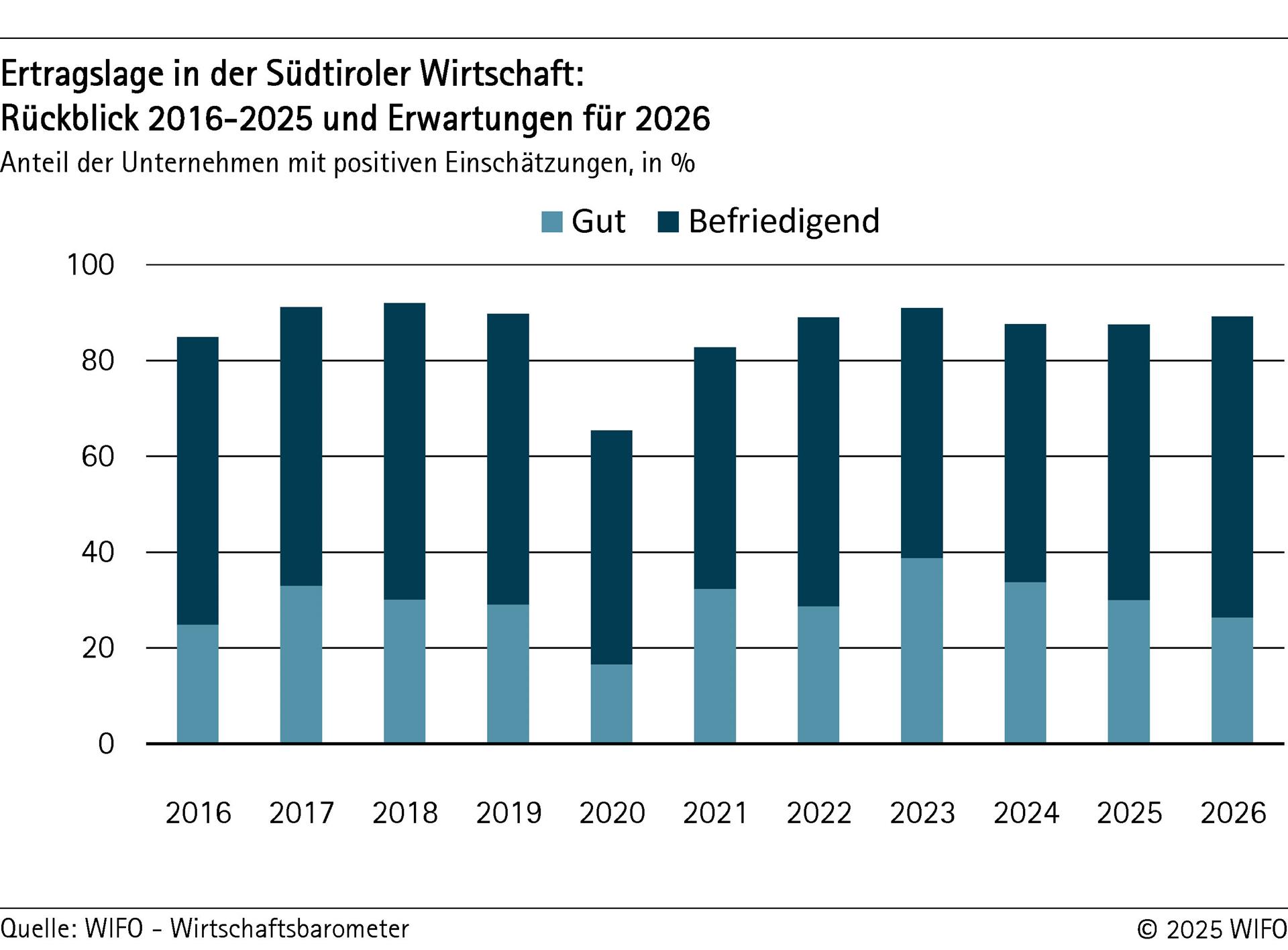 Im Jahr 2025 litt die Südtiroler Wirtschaft weiterhin unter der Schwäche der deutschen und österreichischen Wirtschaft. Die positive Entwicklung der Exporte wurde durch den Lageraufbau in den Vereinigten Staaten und durch Aufträge einzelner Großunternehmen beeinflusst, ansonsten würden die Ausfuhren stagnieren. Die hohe Ungewissheit hinsichtlich der Nachfrageentwicklung bremst weiterhin die Investitionen. Die Beschäftigung und der Tourismus zeigen aber eine moderate Expansion. Das WIFO erwartet für 2025 und 2026 ein Wachstum des Südtiroler BIP um jeweils 0,9 Prozent.