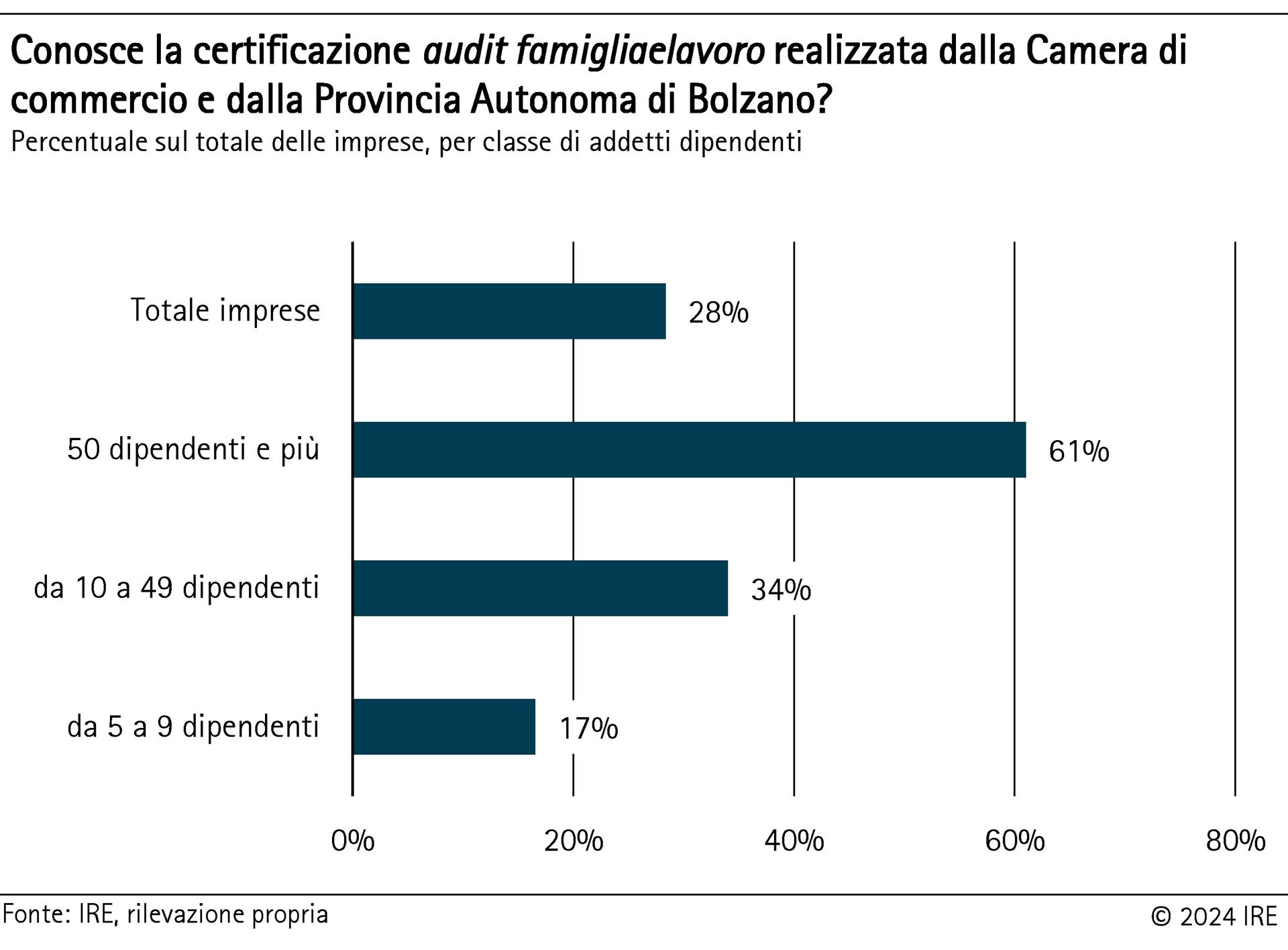 Infine, la certificazione “audit famigliaelavoro”, gestita dalla Provincia Autonoma di Bolzano e dalla Camera di commercio, è conosciuta da circa due terzi delle imprese con almeno 50 dipendenti, ma la notorietà diminuisce tra le imprese più piccole. Vi è pertanto ancora del potenziale per un’ulteriore diffusione di interventi che favoriscano la conciliazione di lavoro e famiglia e, più in generale, il work-life balance.