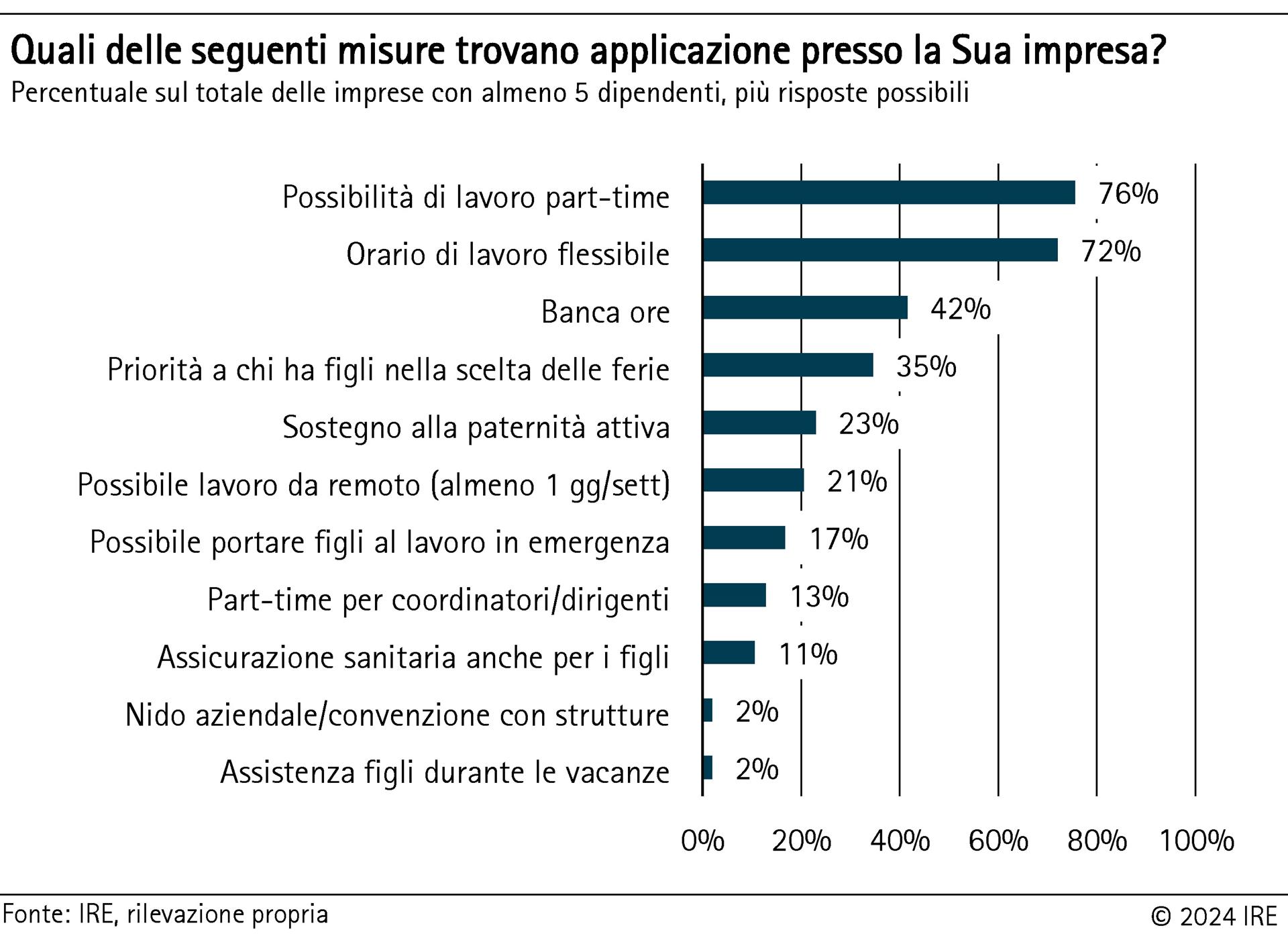 L’indagine evidenzia come quasi tutte le imprese adottino misure che favoriscono la conciliazione tra lavoro e vita privata. Quelle più frequentemente implementate, ovvero la possibilità di lavoro part-time, la flessibilità degli orari di lavoro e l’utilizzo della banca ore si rivolgono in realtà alla totalità dei collaboratori e delle collaboratrici e rientrano nella più ampia sfera del cosiddetto work-life balance.