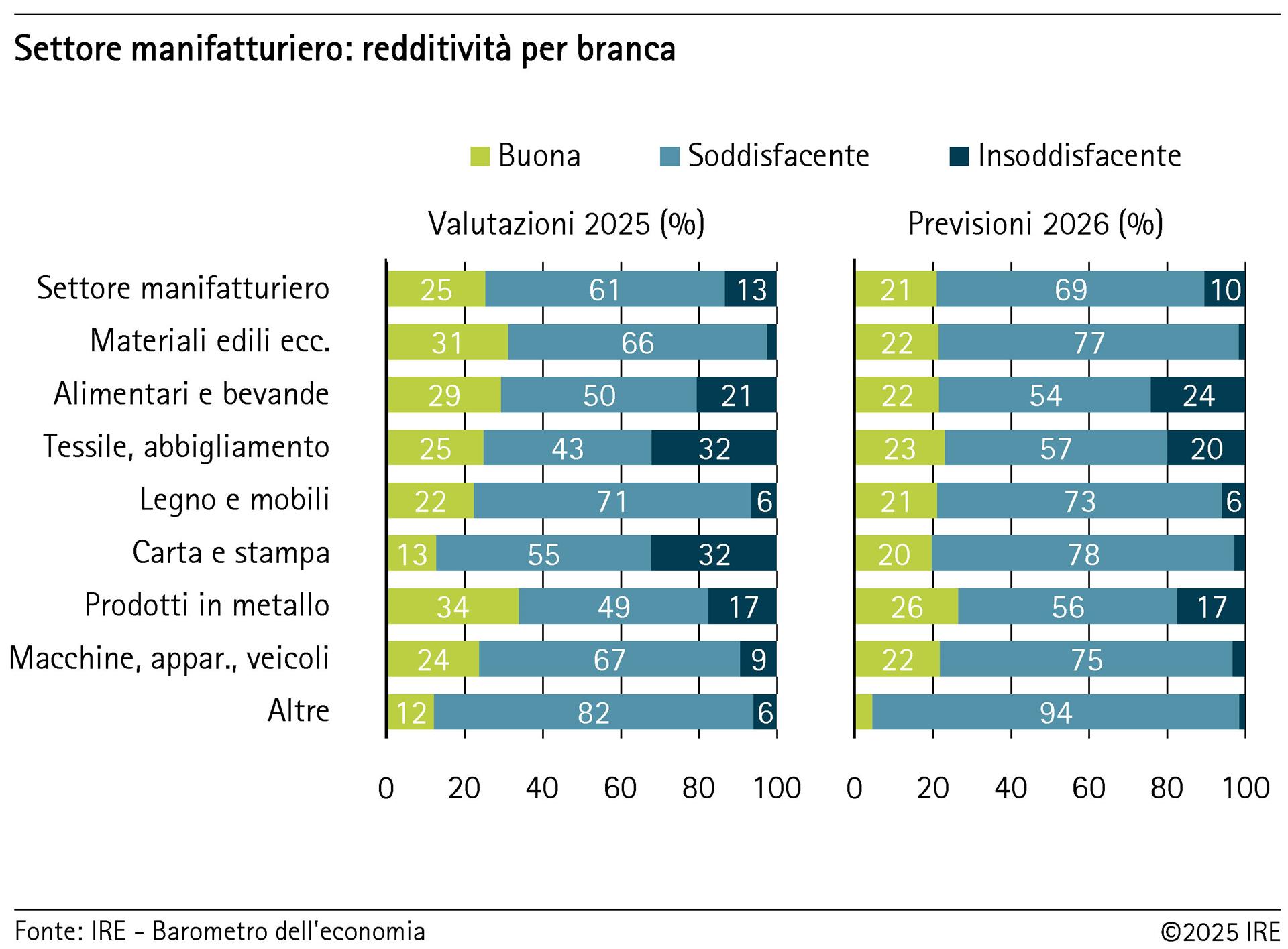 Secondo le imprese manifatturiere, nel 2026 il grado di sfruttamento della capacità produttiva rimarrà sui livelli attuali, pari all’85 percento. La dinamica dei fatturati potrebbe leggermente accelerare soprattutto per le grandi imprese con più di 50 addetti, anche grazie all’incremento dei prezzi di vendita, mentre la ripresa degli investimenti sarà ancora frenata dalla grande incertezza. La crescita dei costi dovrebbe rimanere piuttosto contenuta, permettendo a nove imprese su dieci di mantenere anche il prossimo anno una redditività quantomeno soddisfacente. Il maggiore ottimismo si riscontra nei comparti della stampa, dei materiali da costruzione e in quello dei macchinari e della produzione di veicoli: in queste branche quasi tutte le imprese prevedono una redditività almeno soddisfacente, in circa un quinto dei casi addirittura buona. Più modeste appaiono invece le prospettive nei comparti della manifattura alimentare e tessile, dove una parte consistente delle imprese si attendono per il 2026 una redditività insoddisfacente.