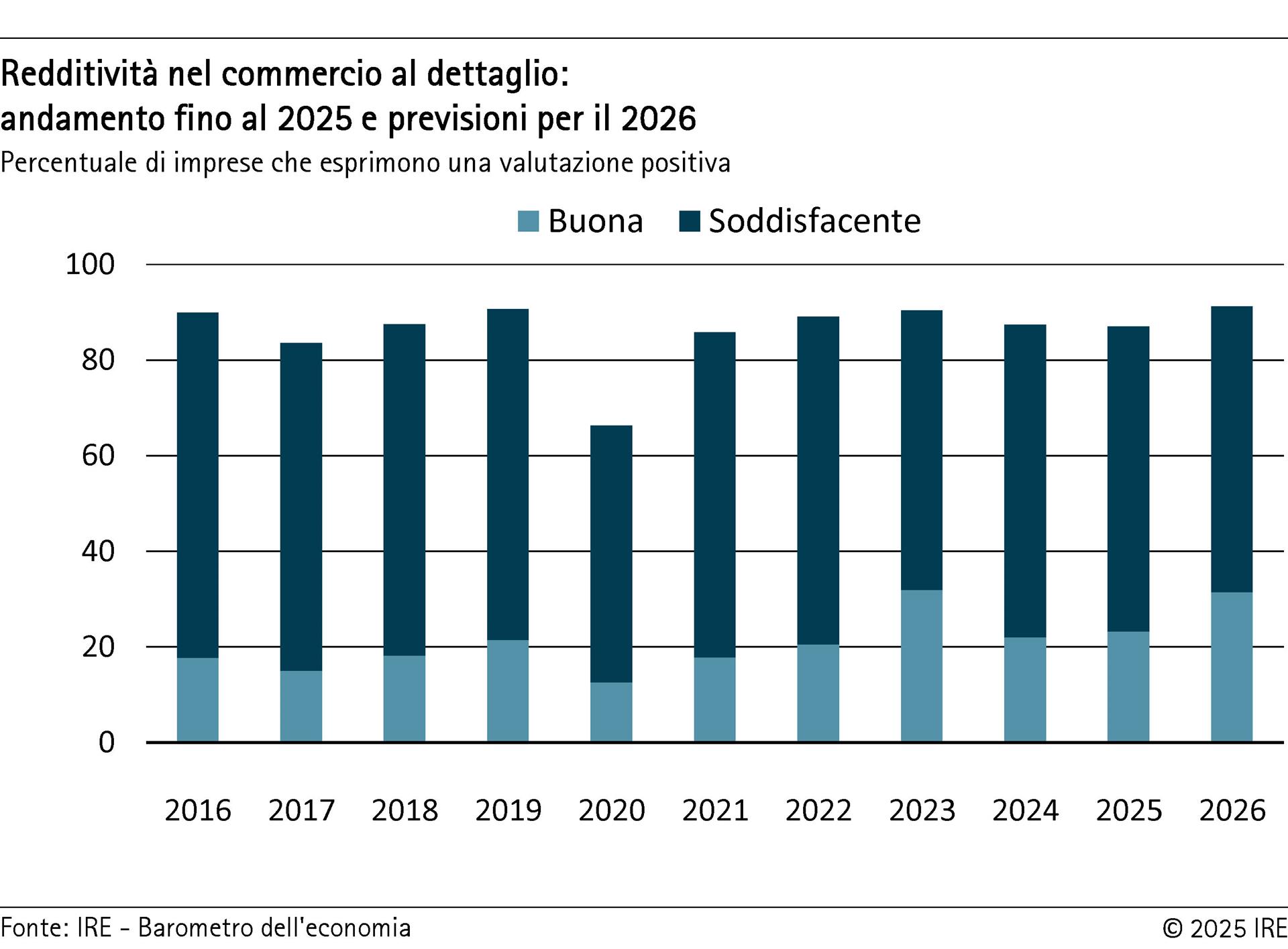 I gestori di supermercati, minimercati e grandi magazzini si dichiarano generalmente soddisfatti dell’esercizio 2025 e segnalano una crescita del giro d’affari, che dovrebbe ulteriormente rafforzarsi nei prossimi mesi. Dopo un 2025 in chiaroscuro, anche i dettaglianti del settore alimentare guardano con ottimismo al 2026, prevedendo una robusta ripresa dei volumi di vendita. Al contrario, nel commercio ambulante le imprese lamentano un diffuso calo dei fatturati, che dovrebbe protrarsi anche nel 2026, e una redditività insoddisfacente in oltre un quarto dei casi.