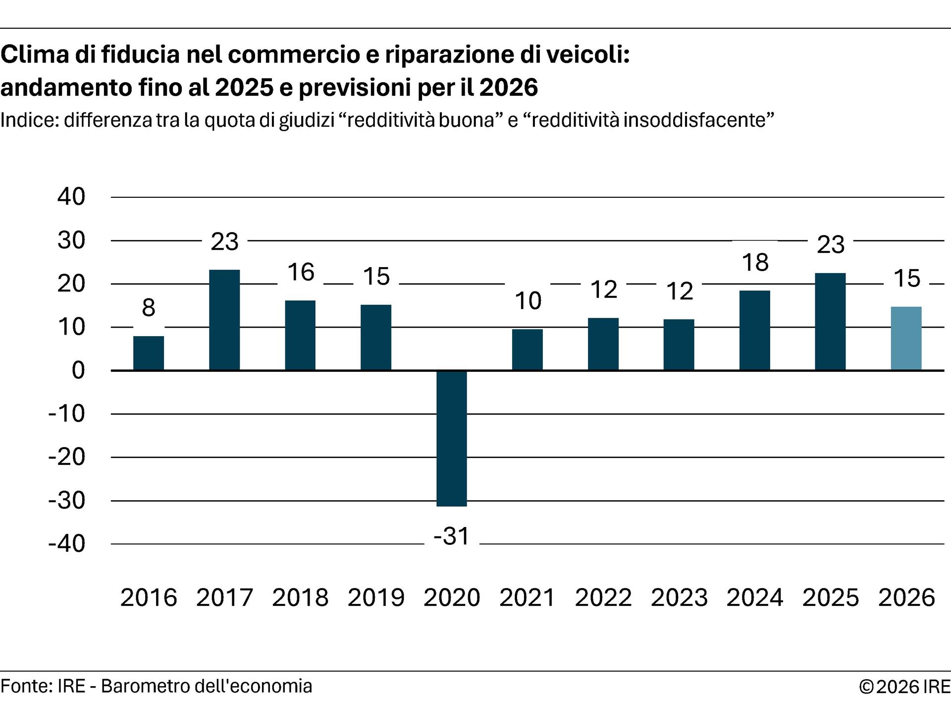 commercio e della riparazione di veicoli la soddisfazione riguardo alla redditività e ai fatturati conseguiti nel 2025 è migliorata rispetto alla precedente rilevazione congiunturale in autunno: il 92 percento delle imprese valuta positivamente il risultato d’esercizio, che viene anzi definito davvero buono nel 30 percento dei casi. Si conferma invece un calo degli investimenti. Per l’anno in corso non si prevede un nuovo incremento dei fatturati, ma la redditività dovrebbe mantenersi quasi sempre soddisfacente, anche grazie all’adeguamento dei prezzi.
