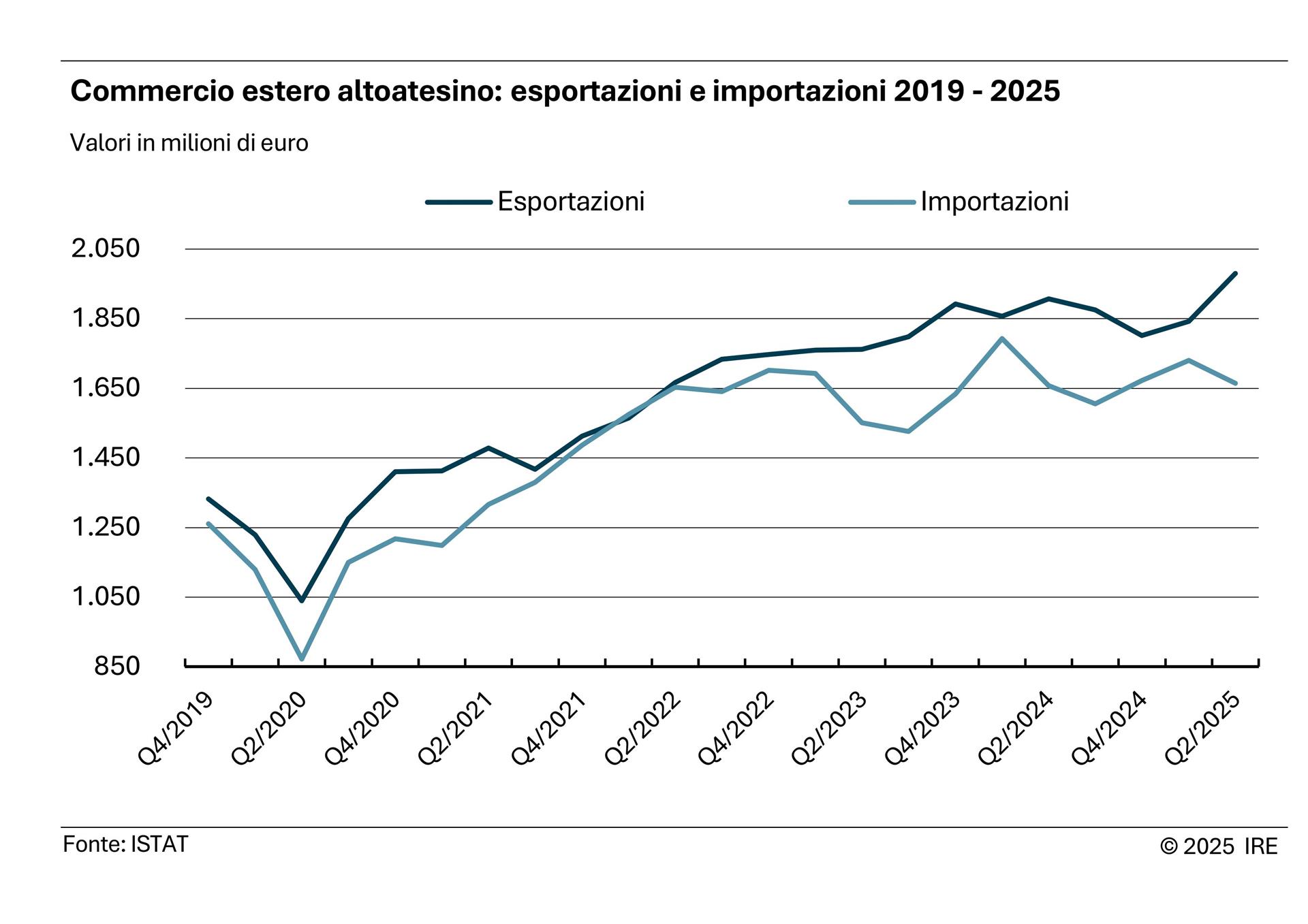 Quattro volte l’anno, IRE pubblica statistiche relative all’import e all’export, suddivise per paese e prodotti. Lo sviluppo delle esportazioni altoatesine viene inoltre confrontato con quello delle regioni limitrofe.